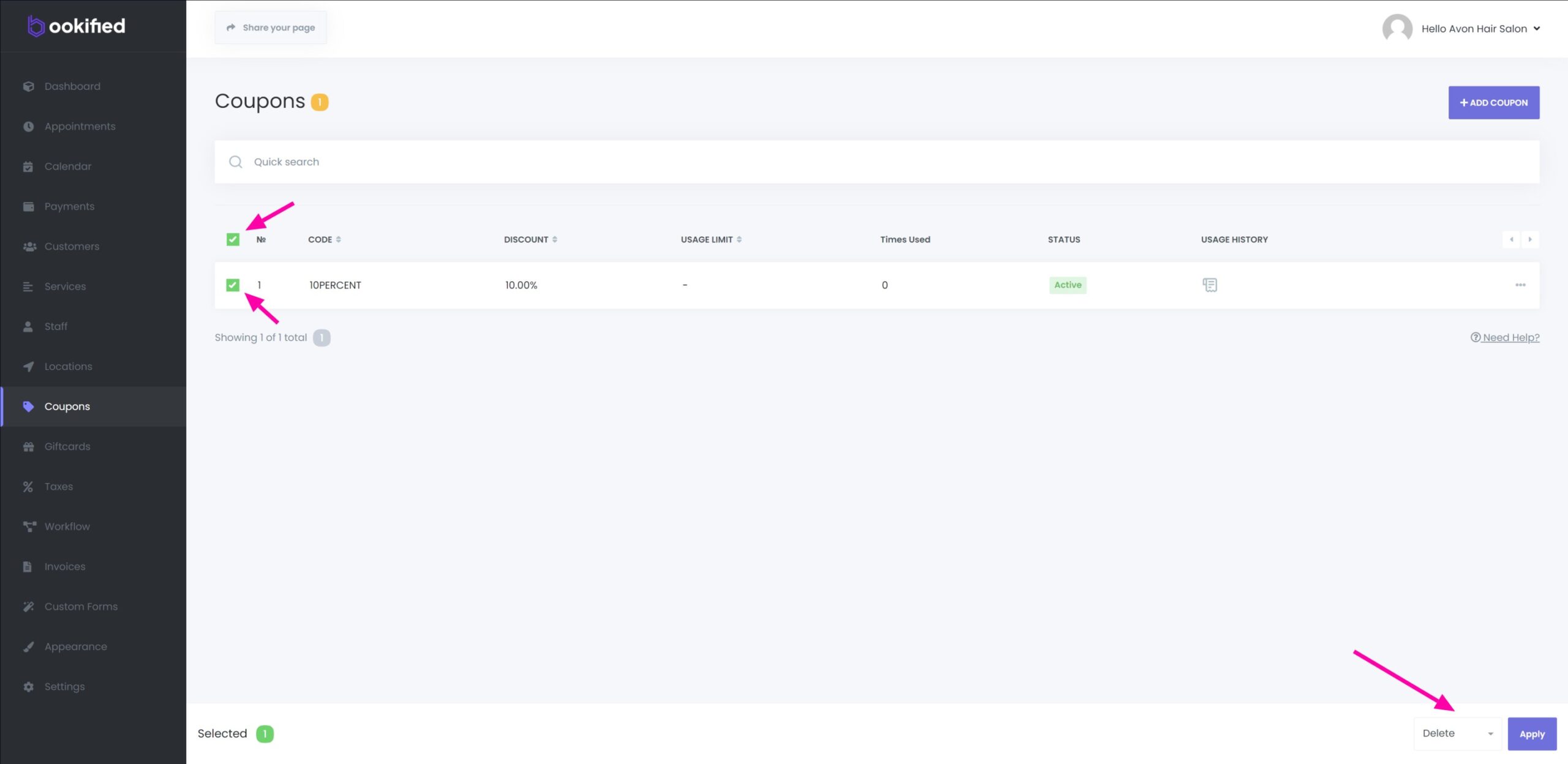 - Edit or delete coupons by clicking the corresponding options next to each coupon, followed by ‘Edit’ or ‘Delete’. Bulk delete options are available by selecting multiple coupons and which will trigger a bottom banner to appear. From there, select ‘delete’ from the dropdown menu and then click ‘apply’ to confirm and execute.