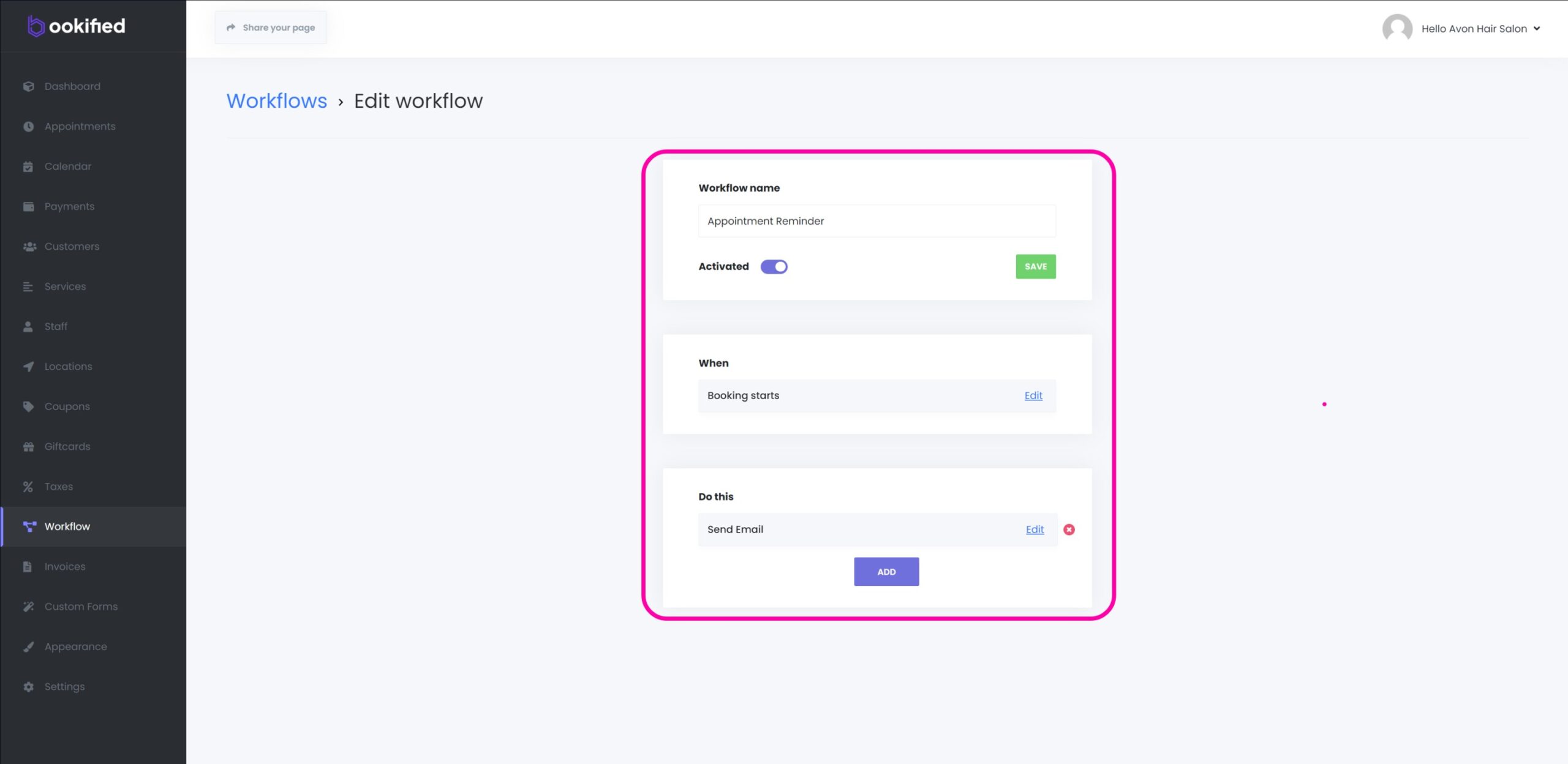 4. After clicking on the ‘create’ button, you will be redirected to the page of the workflow you just created. On this page, you’ll have the opportunity to further modify and fine-tune your workflow as needed. Below is an example of creating a basic appointment reminder that is sent via email 1 day before the appointment.